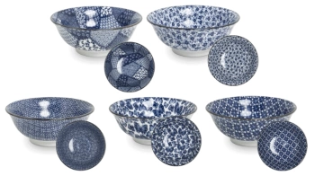 Zestaw dużych misek do ramenu/udonu w niebieskie wzory, 5 elementów