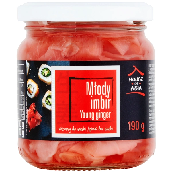 Młody imbir marynowany, różowy marki House of Asia w poręcznym, szklanym słoiku.