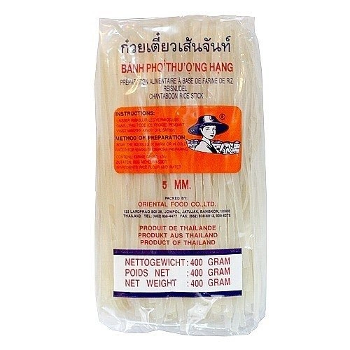 Oryginalny tajski makaron ryżowy w postaci nitek o szerokości 5 mm. Zdrowy i łatwy w przygotowaniu. Niezbędny element diety lekkostrawnej i niskokalorycznej. Doskonały dodatek do tradycyjnej potrawy tajskiej - Pad Thai. Składnik zup oraz wielu popularnych tajskich dań mięsnych i wegetariańskich.