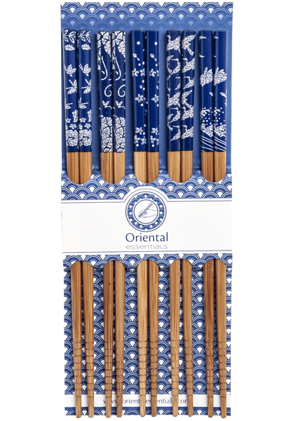 Zestaw pięciu par eleganckich, drewnianych pałeczek o długości 22,5 cm, wykonanych z jasnego drewna, ozdobionych orientalnymi wzorami przedstawiającymi kwiaty, ptaki i motyle na ciemnoniebieskim tle. Pałeczki zdobione kilkoma subtelnymi motywami nie tylko pełnią praktyczną rolę przy stole, ale także wprowadzają odrobinę japońskiego uroku i radości do codziennych posiłków. Gładka powierzchnia i klasyczna forma czynią je wygodnymi w użyciu zarówno dla początkujących, jak i dla osób wprawionych w jedzeniu pałeczkami.