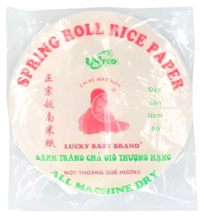 Duże, okrągłe arkusze papieru ryżowego średniej grubości. Mieszanka mąki ryżowej i skrobi z tapioki nadaje płatkom papieru elastyczną konsystencję, która ułatwia zwijanie sajgonek oraz zapobiega rozdarciom.