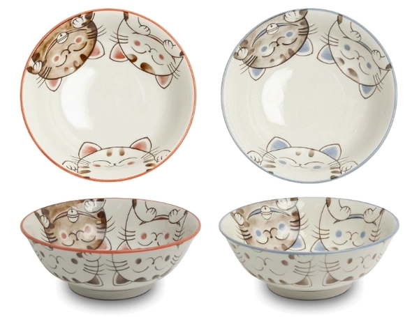 Zestaw 2 japońskich misek do ramenu, udonu różowa i niebieska, trzy kotki, okrągłe 15 x 7 cm - Emro