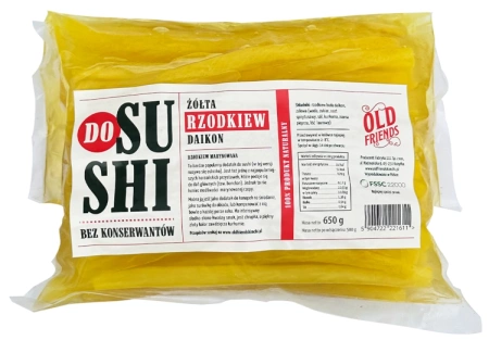 Marynowana rzodkiew daikon marki Old Friends w dużym, wydajnym opakowaniu 650 g, bez grama sztucznych barwników i konserwantów.